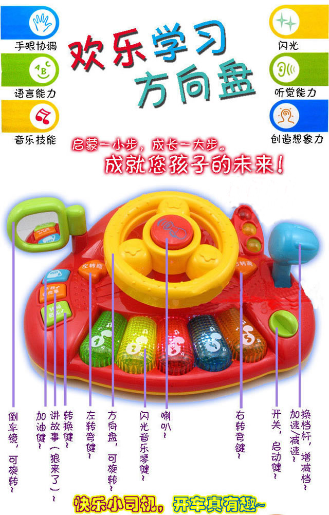三、好了,一切都了解了,那就转动你的“欢乐学习方向盘”开车去玩喽!有趣的语音,真实的汽车声,贴近生活的角色扮演,诱发宝宝快乐自主地学习!转动方向盘,按下喇叭键,宝宝的想象火花瞬间进发,无限延伸。设计独特的站点键和耳熟目睹的交通信号灯渗透了日常生活中的一些基本常识,寓教于乐因此得到了完美的体现!来吧,转动“学习方向盘”开上学习的高速公路!