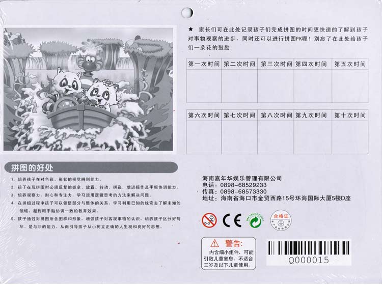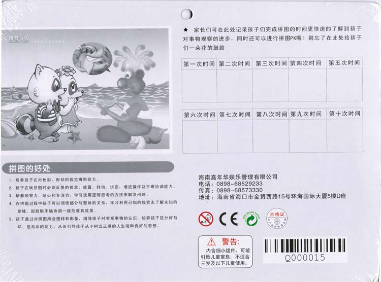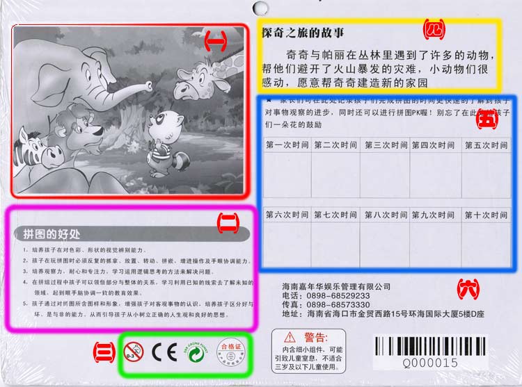 (三)探奇乐园一贯的品质追求在这里得以延续,此款拼图通过3C、绿色环保、检验合格等认证,但因有小片拼图仍建议0-3岁以下儿童不可以单独使用本产品;请探奇所属员工向客人介绍时说到,如有客人带的儿童较小,请提醒我们的客人,不要让孩子单独使用本产品!